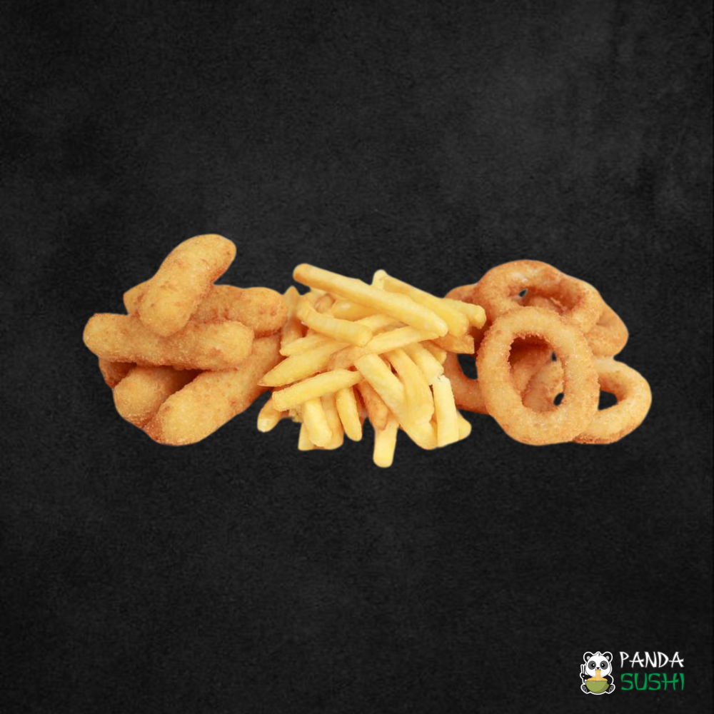 6 луковых колец, 6 сырных палочек, 100гр картофель фри