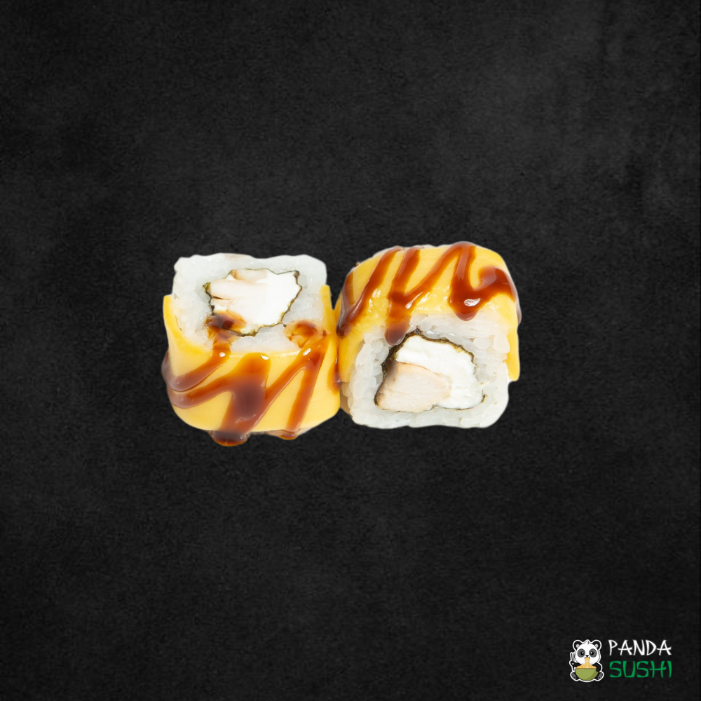 Рис, нори, сыр креметта, куриное филе, сыр чеддер, соус унаги (8шт). В комплекте: 1 соевый соус (30 мл), 10гр имбиря, 5гр васаби.