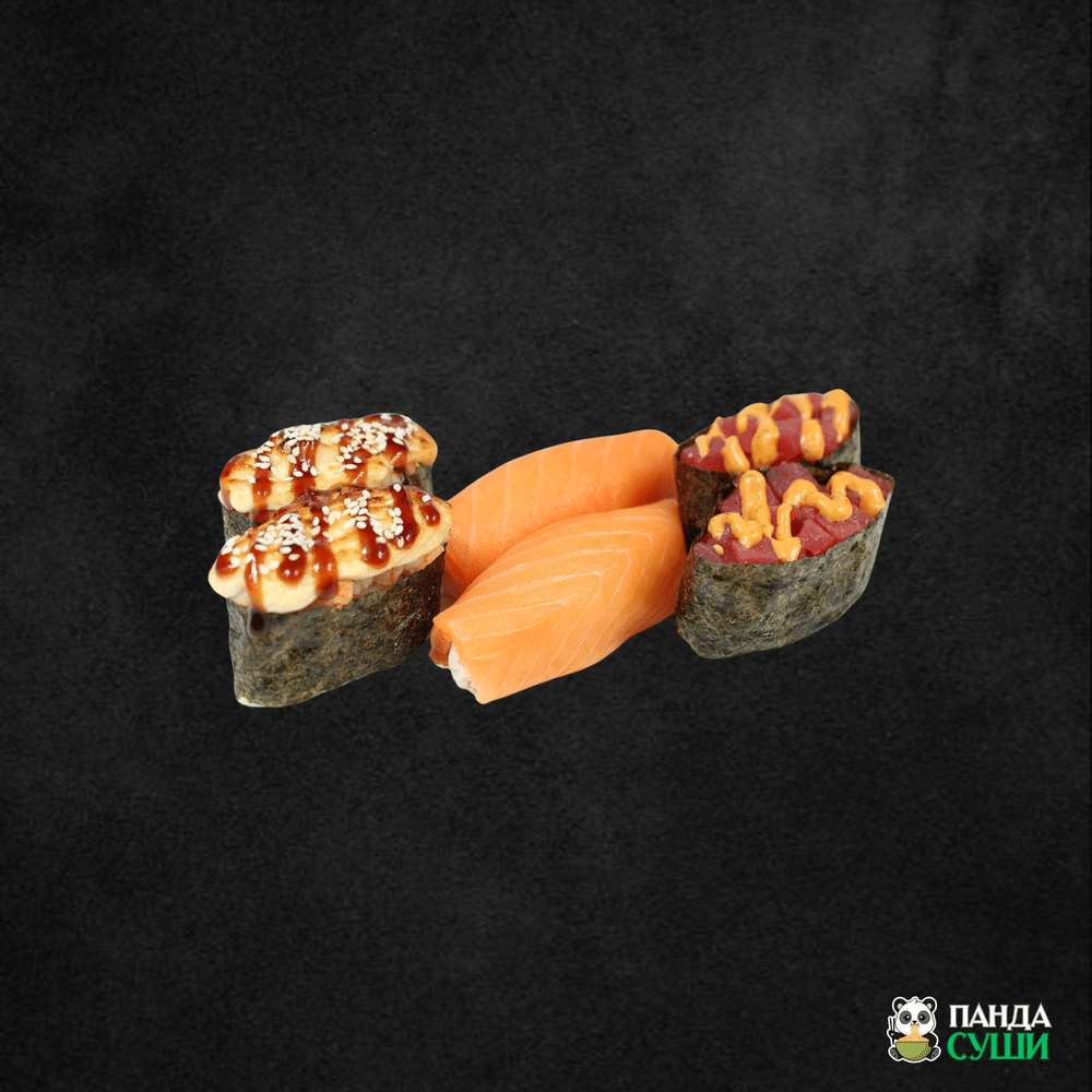 Суши с лососем 2 шт, гунканы запеченные с креветкой 2шт, гунканы с тунцом острые 2 шт. В комплекте: 1 соевый соус (30 мл), 10гр имбиря, 5 гр васаби.