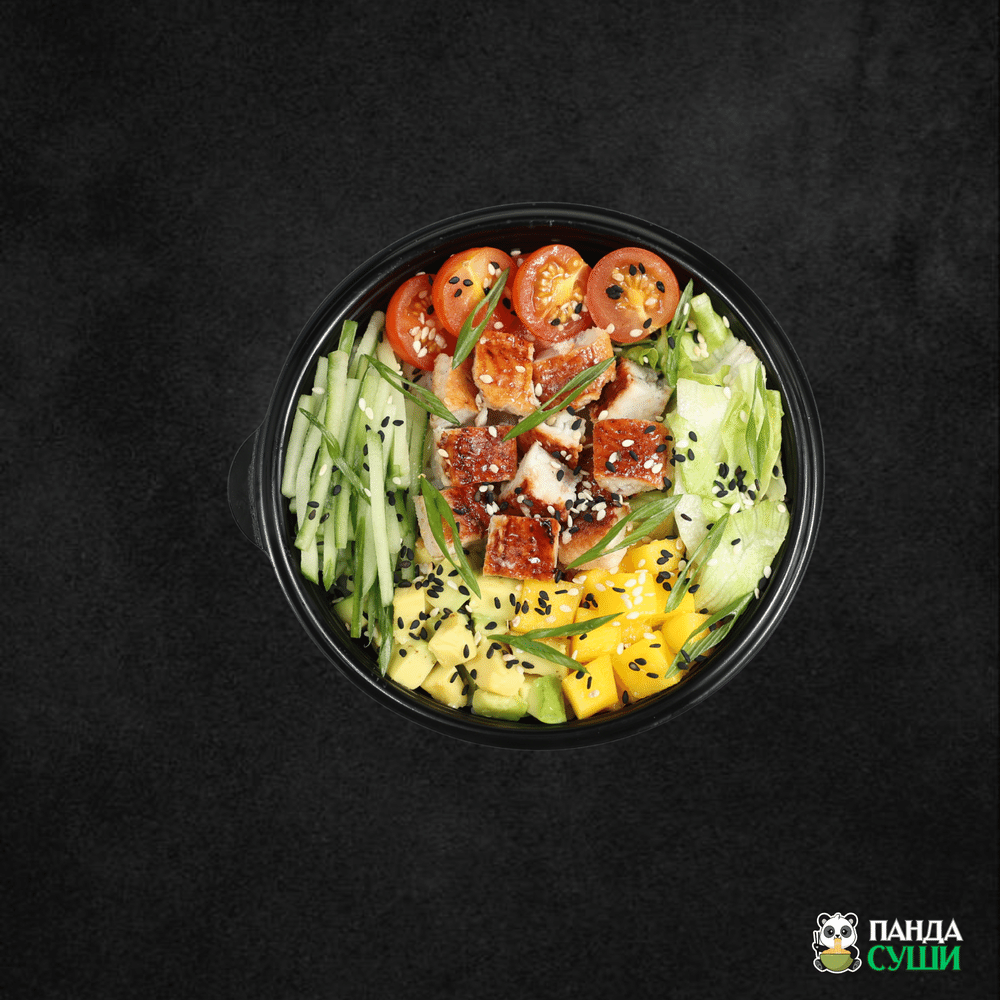 Рис, ореховый соус, угорь жаренный, айсберг, черри, огурец, авокадо, манго, лук перо, кунжут